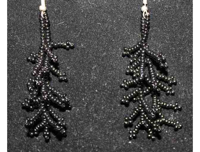 Black glass bead earrings designed to resemble tree branches. The branch section measures 2 1/4" from top to bottom. Just hook them into your ears and smile. Really fun.