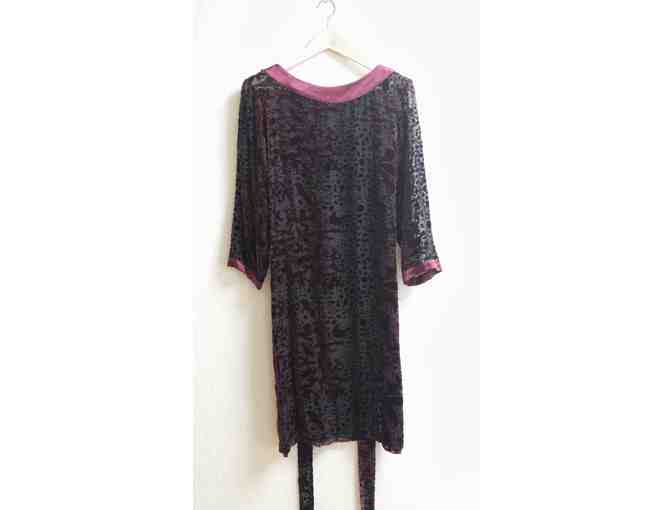 This belted dress is a silk rayon blend with purple velvet burn out in size Large.
