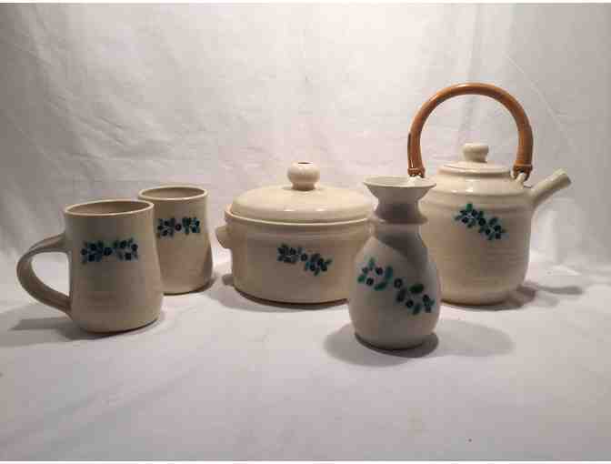 This beautiful set of vintage Port Clyde pottery is hand-painted in a "blueberry" design. It includes a large jar with lid, a tea pot, two tea cups and a vase.