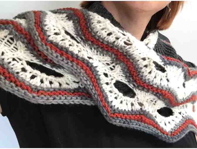 The Esjan scarf, pattern by Stephen West. Made from a variety of fibers including wool, bamboo, alpaca, and acrylic.
