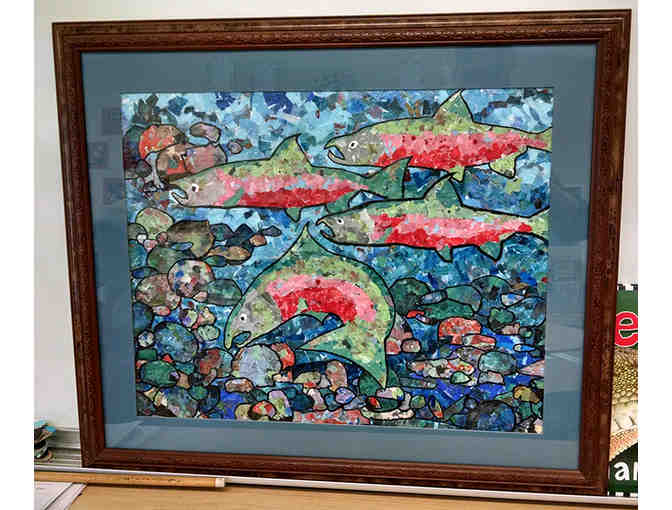 This is an amazing framed piece of Eric Carle style collage art created by the 3rd grade class. The students painstakingly painted every single piece of tissue paper (speckling and marbling to their hearts content), tore, glued and outlined each component. The care and time they put into their art piece really shows and students walked away knowing what it means to produce something collaboratively. This piece will look amazing in any room of your house!