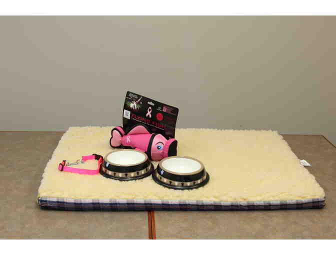Your large or extra-large dog sleeps securely and soundly in her own bed. This one is ivory fleece on one side and flips to a blue, gray, red and yellow plaid on the other. The cover zips off for machine washing in cold water so that it stays neat and clean. With the bed are two break-resistant, dishwasher safe, skid-proof, plastic food and water dishes; a hot pink mesh and link adjustable martingale with a snap clasp, and a neon pink, heavy-duty, flying fish bungy toy that launches up to 100 feet and floats.