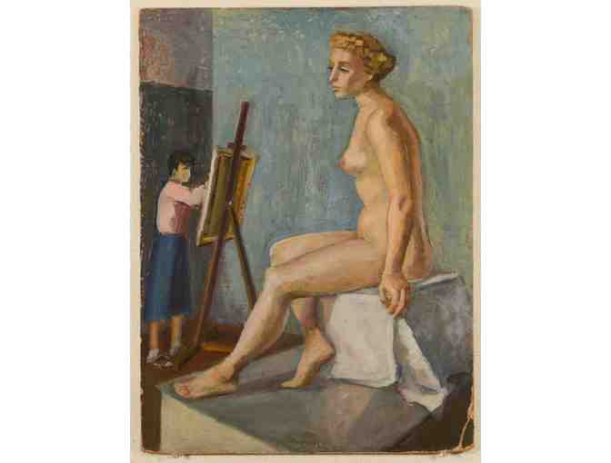 Oil on board painting by Mary Jane Gorton, the heiress of the Gorton's of Gloucester fishing empire. She painted in a formalist, classic style which succintly defines the Brahmin New England culture to which she was born. 18 inches wide by 24 inches high. Unframed. Unsigned.