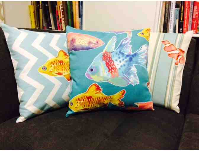 Decorate with this set of 3 handmade pillows that announces beach season! Custom designed for the Waring Auction. The bright fish pattern graces one 16 by 16 inch pillow and fish appliques are repeated on another 12 by 16 inch pillow and16 by 16 inch one--3 pillows in all, in shades of sea blue and aqua. Handcrafted by Waring alumni parent and staffer Martha Bednarz.