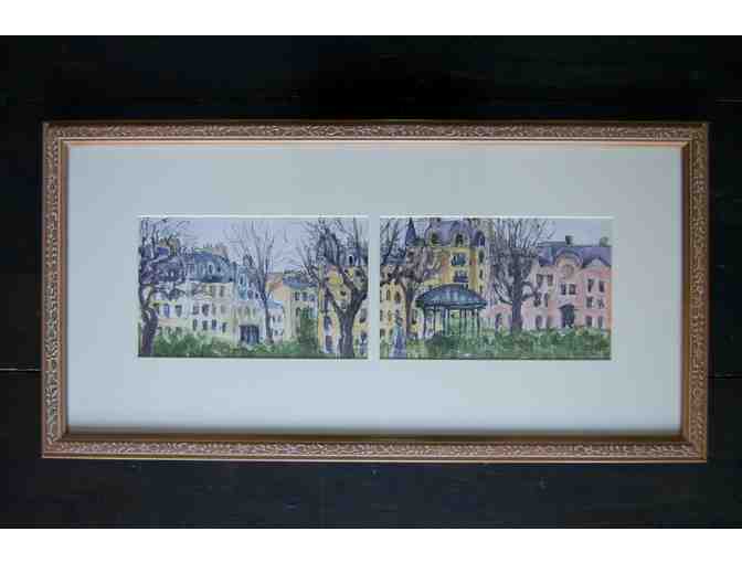 Beautiful framed watercolor diptych of the Square du Temple in Paris by Waring alum and parent Nicole Hupin-Otis. Painted on location, this scene depicts the historically rich square designed by Baron Haussmann in 1865 during Napoleon's reign. Located just a short walk in the marais from the MIJE youth hostel that our Waring students know well, the square designates the spot once occupied by a 'donjon' prison. Here, Louis XVI, Marie Antoinette, and their children were locked up before being sent to the guillotine in 1793. Today, no remnants of the donjon remain, but the bucolic green space is enjoyed by Parisians and tourists alike.