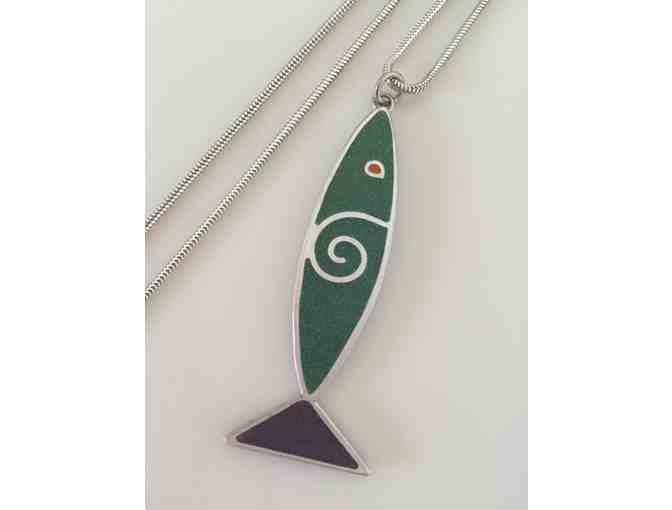 A colorful sterling fish pendant inlaid with epoxy and enamel on a 24" sterling chain. Designed and hand crafted by Waring alum parent, Claire Sanford.