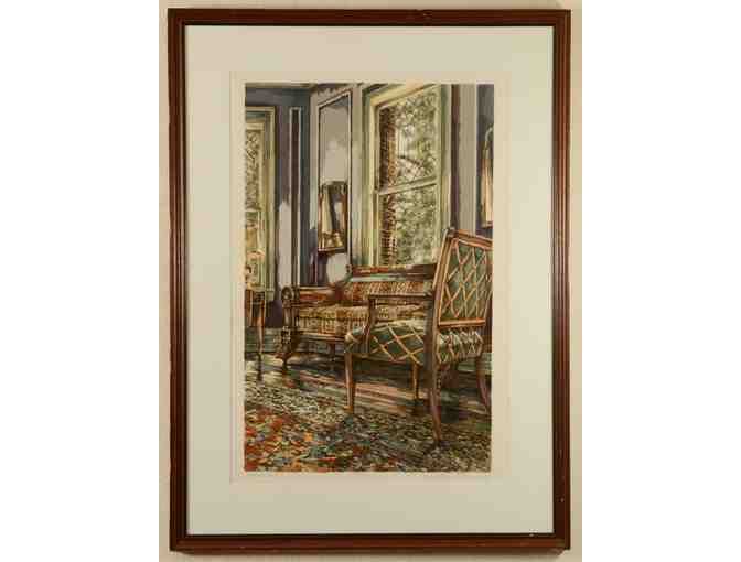 Numbered and signed lithograph print of an elegant room interior by Marcy Shear Wolpe. Matted and framed under glass. Overall size is 24 by 36 inches.