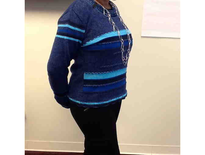 Embellishments make this blue sweater really "pop!" Wear it for those chilly spring mornings and late fall nights.