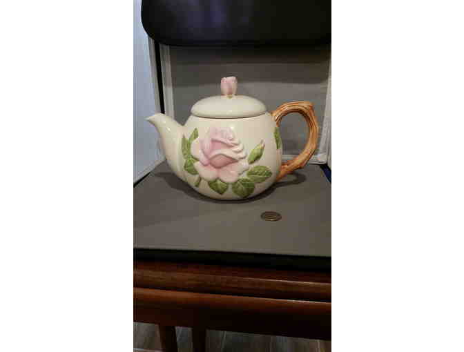 A 4c teapot, from Teleflora.  Ceramic handle is designed as a wood vine, large rose on one side, small rosebud on the other.  The top knob is a rosebud.