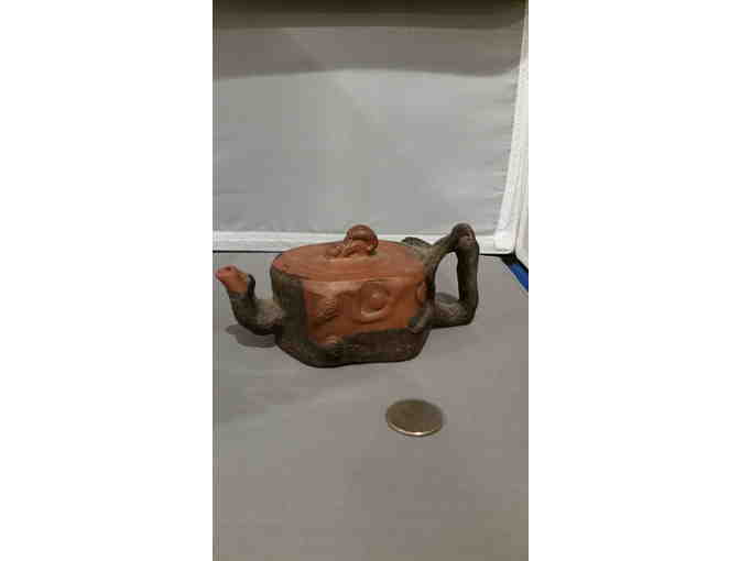 In the Yixing style, red and brown clay teapot has a squirrel guarding the opening top.  The squirrel seems to be hiding nuts and berries imbedded in the design.