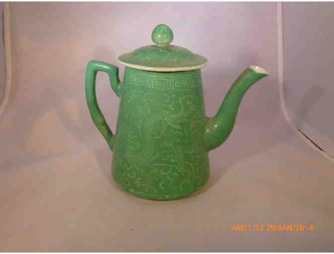 This Chinese ceramic teapot stands over 6" tall. It is styled as a small coffee pot with Greek patterns surrounding the rim and swirls on the pot.
