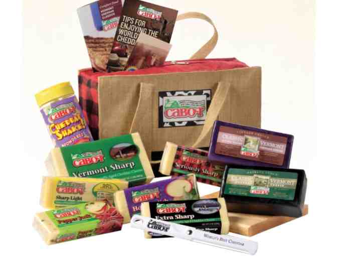 Cabot Cheese Gift Bag includes a generous assortment of Cheddars including Extra Sharp, Seriously Sharp, and Reduced Fat. An assortment of flavored cheeses including Pepper Jack and Horseradish And finally a few extras including a cheese knife and wooden slicing board and a few recipe brochures.