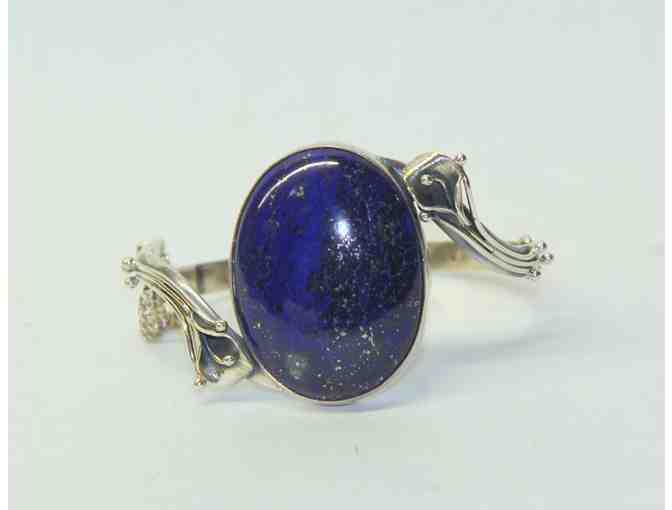 Exquisitely executed Art Nouveau styled bangle bracelet in Sterling silver (marked 925) and a 2" undyed Lapis cabochon. Absolutely stunning.Continental, probably French, calla lilies, one of a kind, natual lapis , custom made.