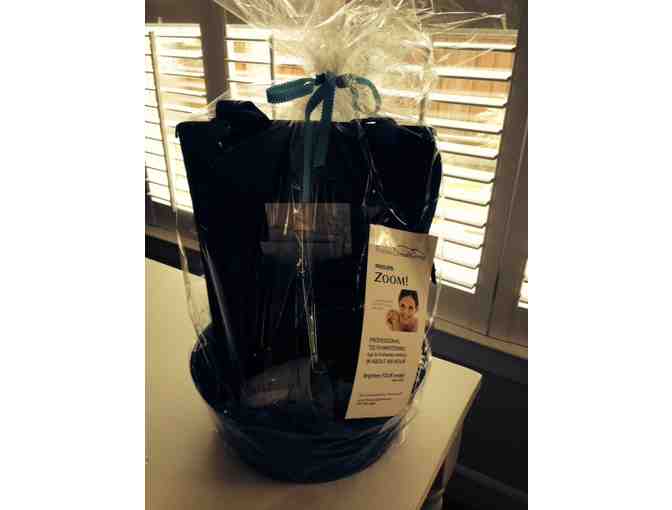 A brighter smile in about an hour. Zoom whitening can whiten your teeth up to 8 shades whiter! This gift basket comes with a mug, reusable bag, a Oral B tooth brush and your gift card for whiter teeth.