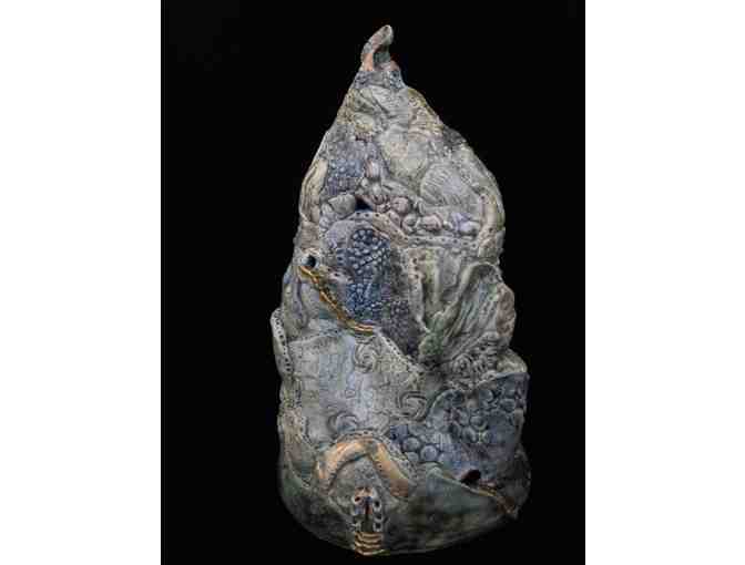 Teals and greens reflected on the walls of this undersea palace mirror the undulating currents of underwater sea life. Echoes of seashells, kelp, and stones embrace golden arched entrances, stairs, and hidden entrances through which only the mythical can venture. This hand-sculpted, ceramic spirit tower by Carolyn Siegel will add whimsy and delight to your home or garden.