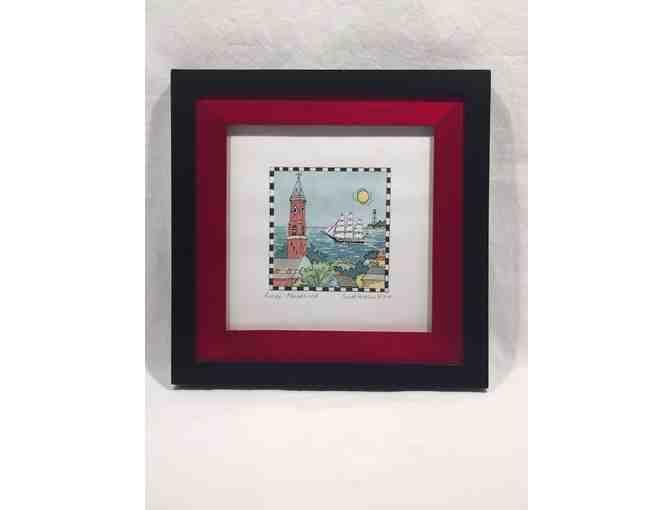 This lovely framed image of the Consitution's visit to Marblehead is a rare item. It is a limited edition Hestia print and is signed by original founder Linda MacDonald. Such a great memento or gift!