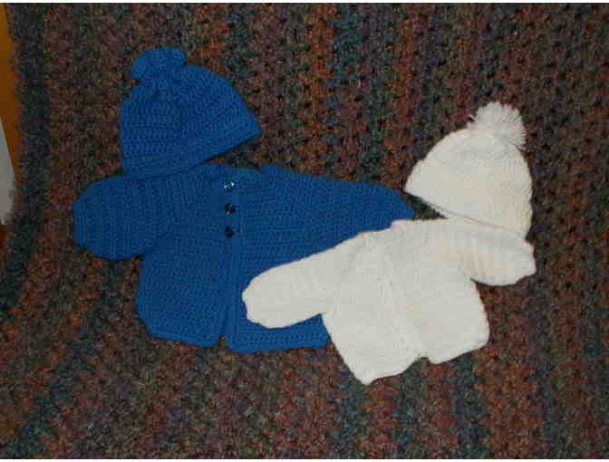 Hand-crocheted with soft white yarn and lots of love, this sweater and hat will keep baby cozy and warm. Approx. size 3-6 months.