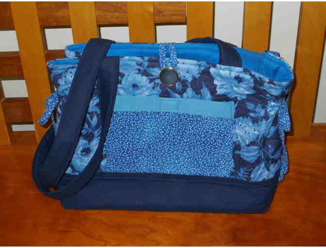 Tote your items in this shoulder purse beautifully quilted in shades of blue florals.