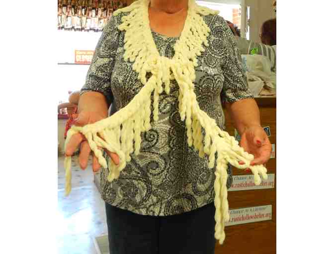 This approximately 72" fashion scarf was handcrafted and donated by Maria Cole