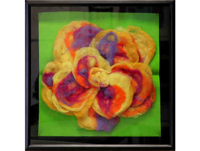 Teacher Carole worked with each student to foot felt a petal and the children were further supported in this fun process by Teacher Yasuko, Kerstin Pintus and Lily Malekpour. Then Teacher Yasuko stitched it all together to create this beautiful and unique felted piece that comes beautifully framed by Kerstin Pintus in a black shadow box.