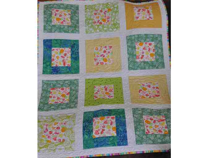 Enjoy this Spring Block Quilt! 32" x 40" made of 100% cotton top and back with 20$ polyester batting to keep it's shape. A handmade labor of love by a Meadow Nana.