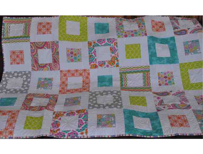 Enjoy this Spring Block Quilt! 39" x 55" made of 100% cotton top and back with 20$ polyester batting to keep it's shape. A handmade labor of love by a Meadow Nana.