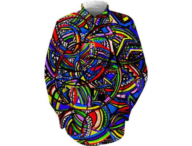 On a more personal experience note: When I ordered the original samples, I could not resist ...I had to wear them, and these art shirts have become my "go to essential" in my wardrobe! I could not begin to even describe how comfortable and versatile they are...with jeans, open with a tank under, or belted...they are color saturated, have long lasting sturdy heft, yet these shirts are so dang comfortable, I keep ordering more! Yes, it is fun..really WAY COOL to WEAR ART!! (WBK)