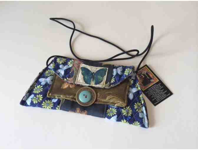 A handmade clutch bag from Janet McKinstry Designs made from salvaged vintage materials. This butterfly and daisy covered bag has a pocket on the outer front plus two small pockets inside. Measures 5″ H 10″ W 3″ D with a 23″ Cord Strap.