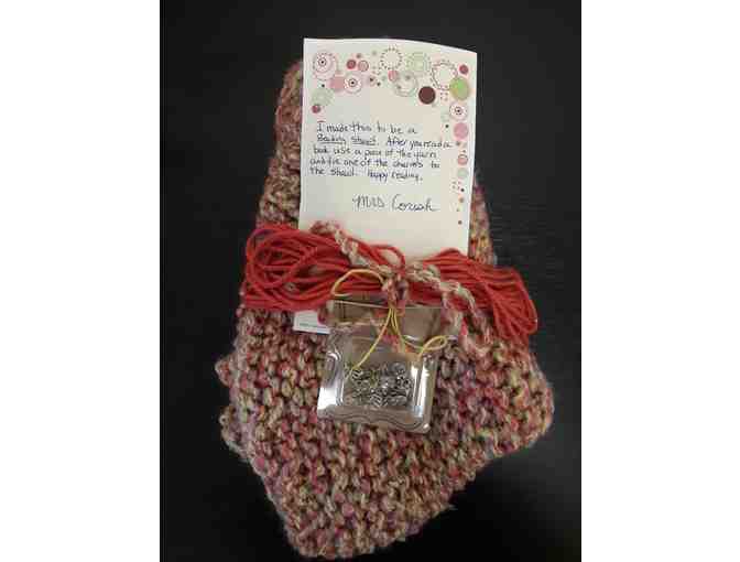 Bid on this lovely, hand-knitted reading shawl crafted by our own Beth Corish. Mrs. Corish includes charms and yarn for attaching to your shawl after reading a book. The shawl is knitted with varigated, worsted yarn in hues of red, peach, purple and green.