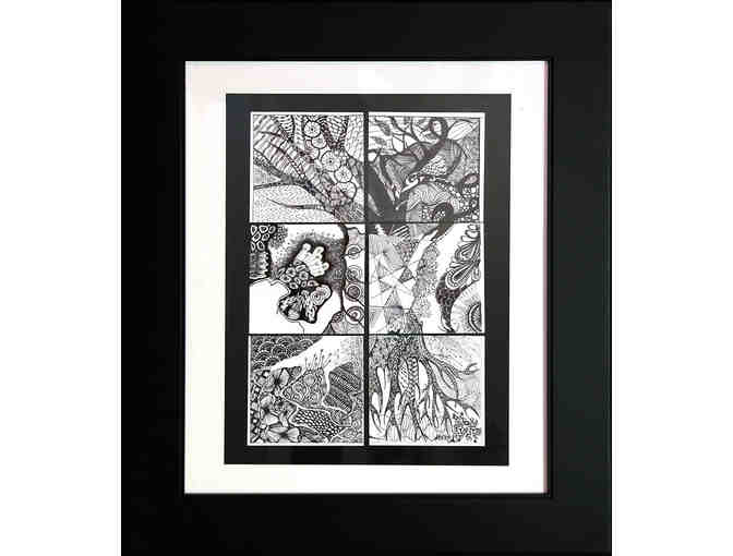 The black and white Zentangle drawing "The Tree" made by Namrata K., Alanta B., Gina P. and Savanna C. is beautifully displayed in a black frame.