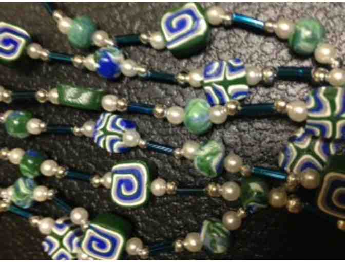 This delightful necklace and earring ensemble will be your favorite summer accessory! The handcrated green blue and green beads are paired with silver, blue and pearl accent beads....truly unique and "one of a kind."