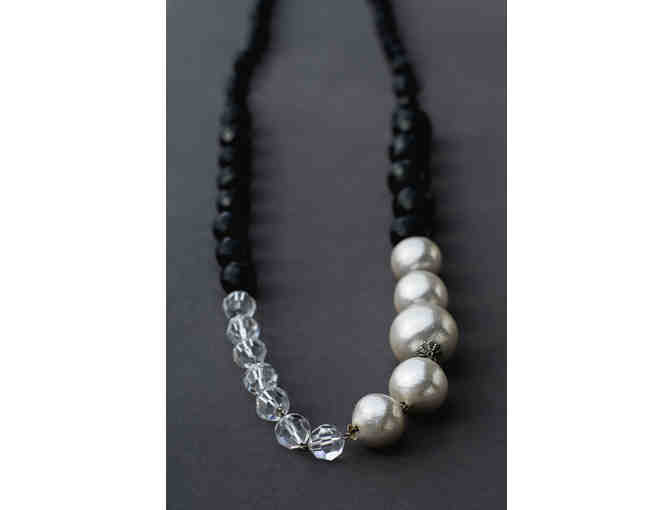 Made with unique high quality materials, this 21" long single strand bead necklace will be the envy of every lady at "Going Gatsby."  It features black and clear glass beads with cream "cotton pearls."  Shimmering!