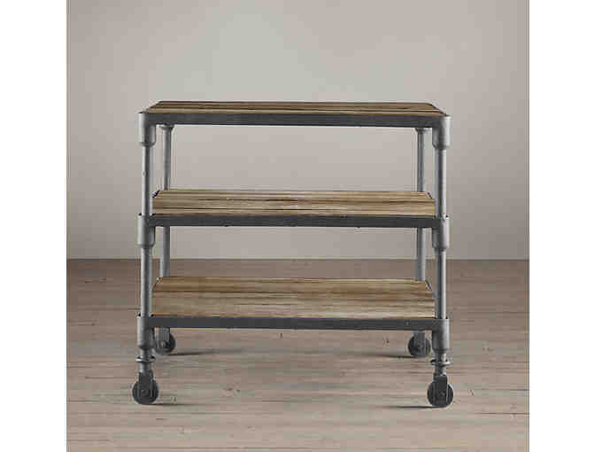 1 new Dutch Industrial side table, 28" size, from Restoration Hardware. Our distressed table pairs the warmth of reclaimed elm with warm, aged metal frames for an industrial, imperfect look. Hand-applied patina; functioning caster wheels; expansive shelves offer ample storage and a showcase for art books. Given their previous lives as antique doors, the shelves and table top may have holes. Nicks, nail marks and imperfections reveal the wood's age and provenance.