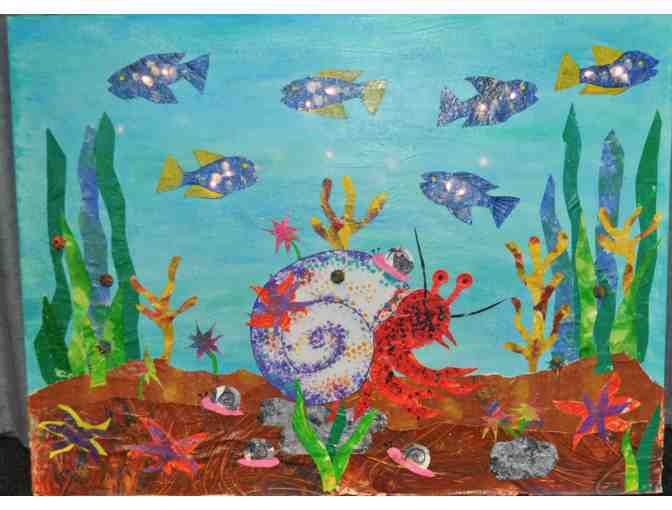 We all remember the wonderful world of Eric Carle as a child. Mrs. Alexandrov and Mrs. Vollmer's kindergarten class at Corona Creek has created a beautiful painting that takes you through the pages of the wonderful story " A House for Hermit Crab" This package comes with a painting and book Signed By Mrs. Alexandrov and Mrs. Vollmer's class.