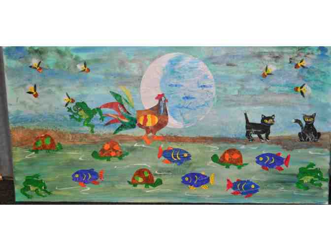 We all remember the wonderful world of Eric Carle as a child. Ms. Sartori's kindergarten class at Corona Creek has created a beautiful painting that takes you through the pages of the wonderful story "Rooster's Off To See the World" This package comes with a painting and book Signed By Mrs. Sartori's class.
