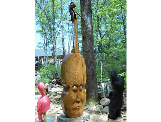 A chainsaw carving with hand-carved and metal work finishes and details by New Hampshire award winning Chainsaw carver and artist Michael Martineau. This upright bass guitar was carved from one piece of Butternut also known as White Walnut. However, the neck of the bass can be removed. Michael lost his life to suicide on February 12, 2015 so this is a one-of-a-kind piece. This piece should be displayed indoors.