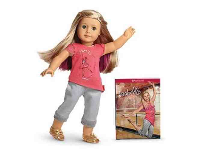 American girl doll Isabelle (2014 Girl of the Year). She arrives with a sequined coral tee and metallic denim pants with knit cuffs, golden dance shoes, rosette leotard, pink-tipped hair highlights, and her "Meet Isabelle" paperback book.