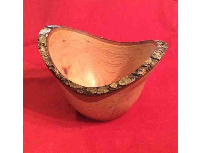 Hand-turned oblong oak bowl with natural bark edge, crafted by Greenwood grandparent Jim Day. Approximately 7.5"x 5.5" inches.