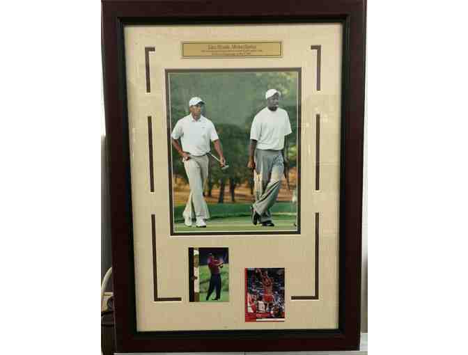 This framed photo captures sports legends Michael Jordan and Tiger Woods playing a round of golf at Quail Hollow. Item includes nameplate, laser cut 3-D Tiger Woods and Air Jordan logos and measures 12x14.