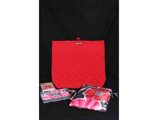This colorful Vera Bradley handbag trio includes a quilted Tote, Collapsible Duffel and a Wristlet. The tote comes in "Tango Red" and the duffel and wristlet come in the coordinated pattern "Cheery Blossoms" which is comprised of reds, black and white flowers. The tote is a great basic shape that’s perfect for work or play, its roomy interior includes three handy slip pockets, and the 12-1/2" strap drop fits nicely on your shoulder. It has a removable baseboard. Spot clean.