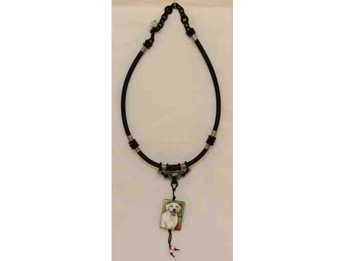 Show off your favorite breed with this hand painted onyx yellow Labrador Retriever charm accented with two beads. The rectangular bead features a yellow labrador in a sitting position on a green background. The bead hangs from a black and silver large gauge thread-wrapped necklace with bead closure.