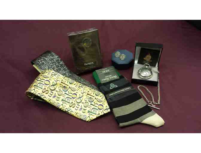 Like to arrive in style? Check out this selection of beautiful silk ties, one in black and grey, the other in yellow and green, both with woven designs that combine Celtic artwork from the Middle Ages with a classic contemporary pattern. Complete the accessories with men’s dress socks from Patrick Francis of Ireland, capped off with a beautiful men’s pocket watch and set of sterling silver cuff links. And keep fresh with this “Patrick” cologne spray: a rich and daring scent with fresh green notes of fern and pine. You have arrived!