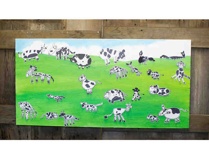 24”x48” canvases with appliqued cow drawings set in a landscape painting. Each student in the class created their own cow to graze upon the field.