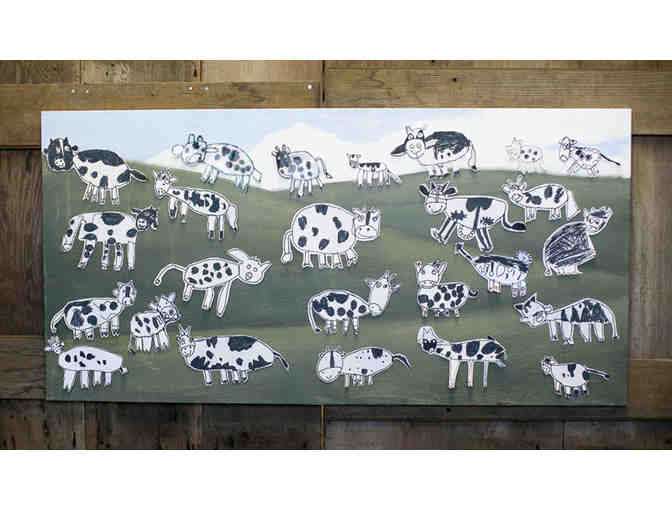 24”x48” canvases with appliqued cow drawings set in a landscape painting. Each student in the class created their own cow to graze upon the field.
