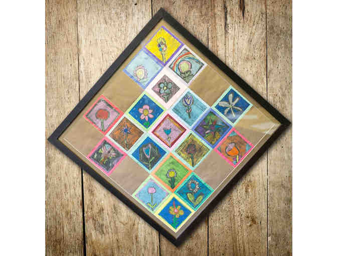 32”x32” framed and matted drawings of imaginary flowers. Each student created their own flower for this collaborative piece.