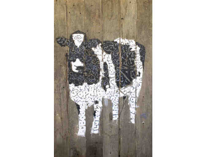 30”x48” composite cow paintings on barn wood using student names painted in black or white.