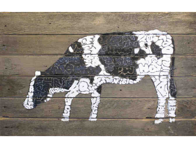 30”x48” composite cow paintings on barn wood using student names painted in black or white.