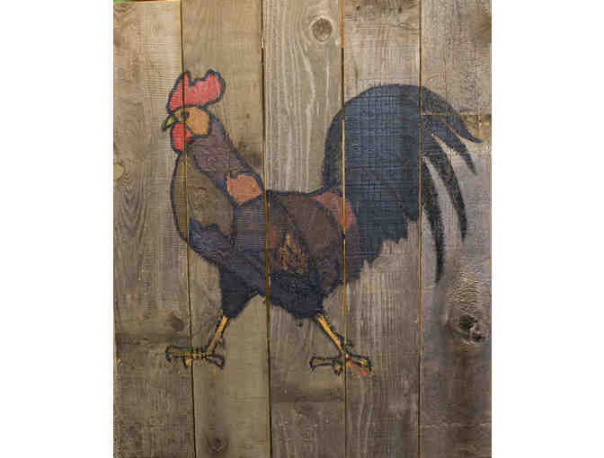 36”x30” composite rooster paintings on barn wood.