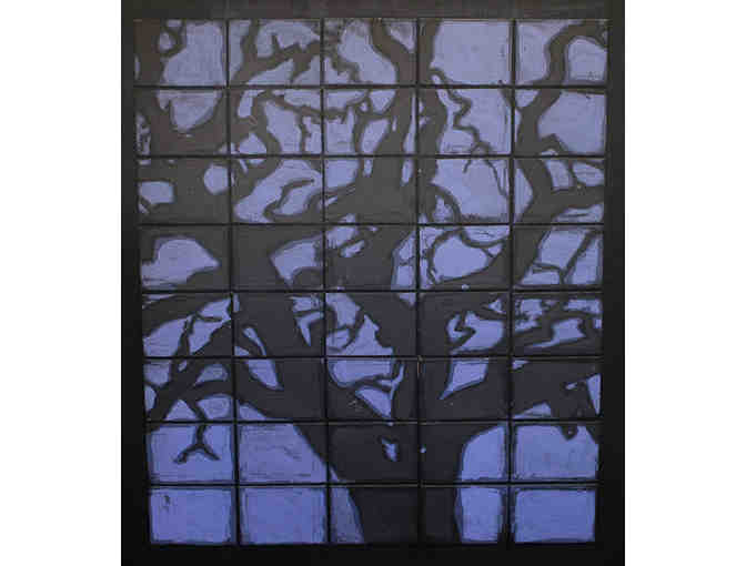 Faux stained glass paintings of oak bough silhouettes at night made up of panels mounted on wood.