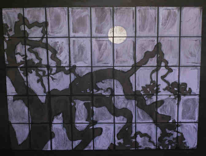Faux stained glass paintings of oak bough silhouettes at night made up of panels mounted on wood.